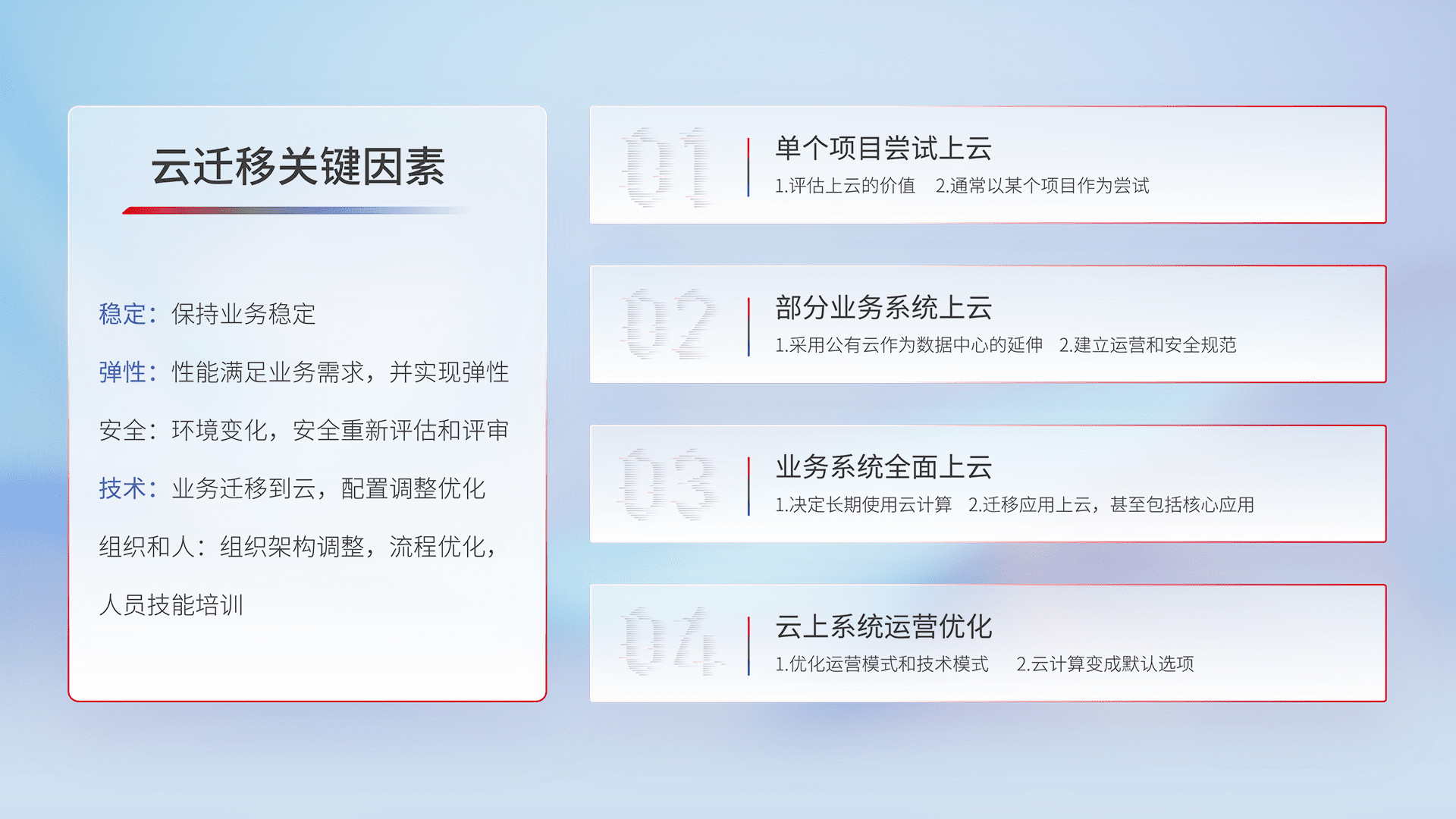 结合实际业务,,从规划设计、、、、云平台选型、、云原生改造、、、、数据迁移、、、、集成交付,,,迁移全过程为客户识别最佳上云路径,,做好风险识别管理,,设计网络架构、、、、身份权限、、、、安全审计合规、、、操作审计、、日志审计、、、监控告警策略、、、、多站点容灾设计等,,对云上基础设施进行整体规划,,,提升IT治理水平,,,以满足弹性、、、高可用、、、高性能的需求。。