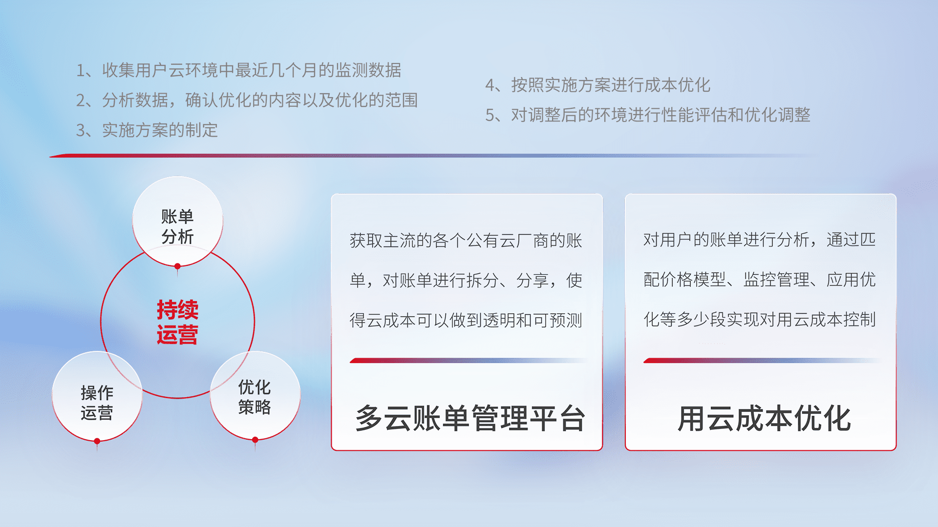通过多云纳管,,,以统一的资源数据模型把客户的云资源进行抽象和封装,,,,进而实现对多云资源的统一操作,,,保障云资源管理的可靠性、、稳定性与可用性。。量身定制化运维内容,,配置、、、开发运维、、、补丁管理、、、、备份、、监控、、、、认证和访问管理、、审计和日常巡检等,,,保障在用云过程中的可靠度,,,稳定度以及高可用率。。。